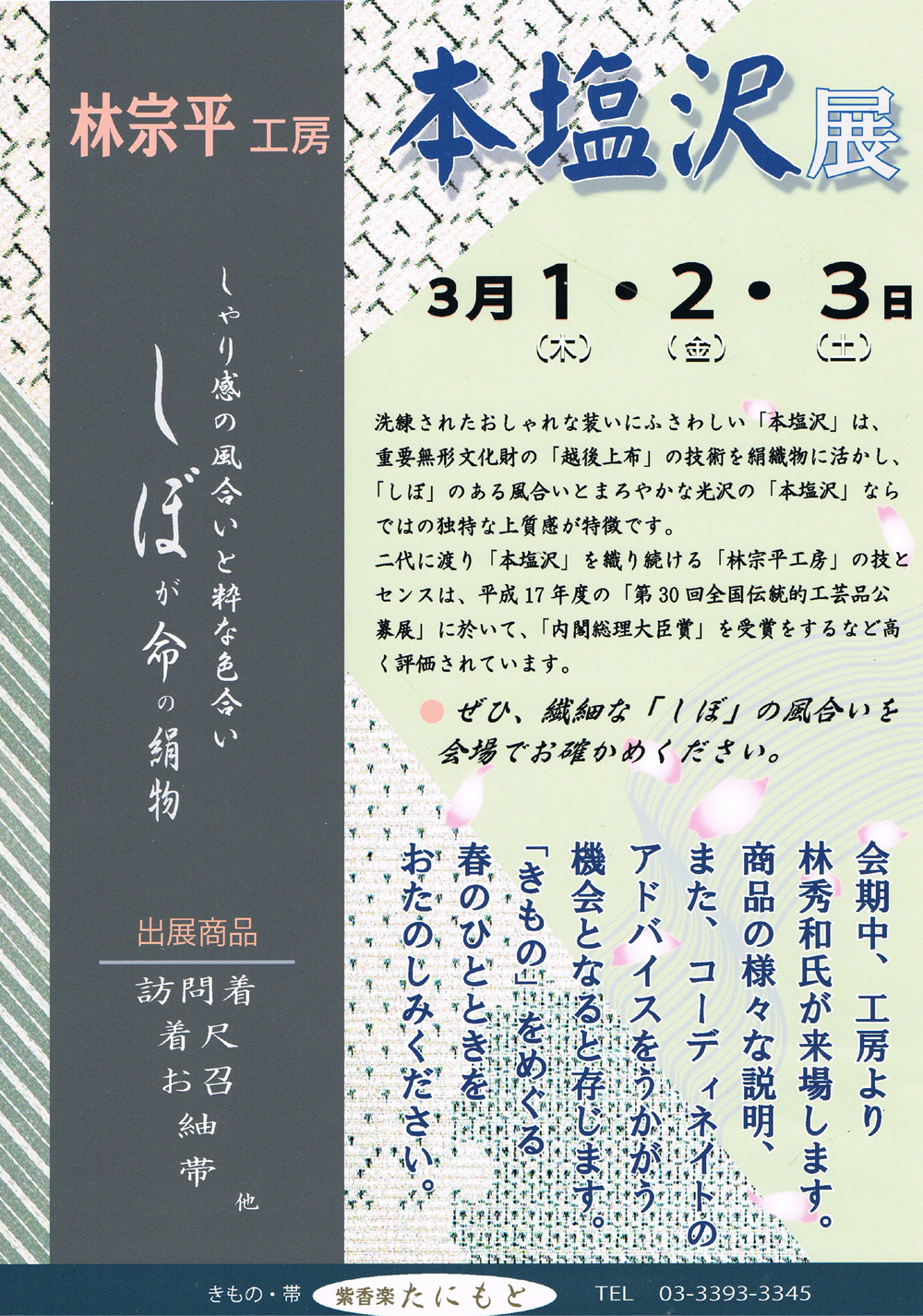 二代に渡り「本塩沢」を織り続ける「林宗平工房」の技とセンスは、平成17年度の「第30回全国伝統的工芸品公募展」に於いて、「内閣総理大臣賞」を受賞するなど高く評価されています。